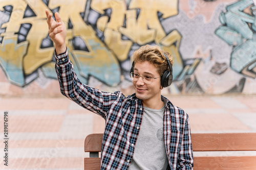 © carles, Obraz premium young man listening to music is waving hand and sitting on a bench