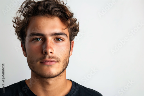 Fototapeta premium young man looking at the camera. Isolated on white background. serious face, wearing a black T-shirt