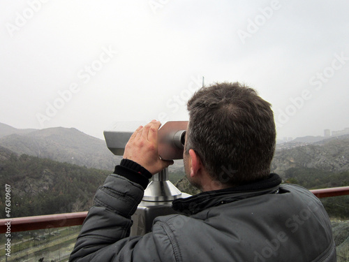 © mehizm, Obraz premium Young Man Looking From Above Through Binoculars