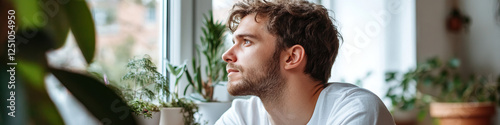 Obraz premium Young Man Looking Out Window with Indoor Plants