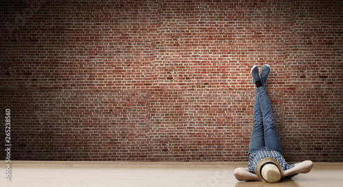 © Sergey Nivens, Obraz premium Young man lying on the floor with legs raised up on the wall. Mixed media