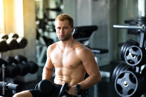 © NVB Stocker, Naklejka premium Young Man Naked bodybuilder exercising lifting with dumbbell at gym. .Gym equipment and sport concept. Fitness Healthy lifestye and workout at gym concept.