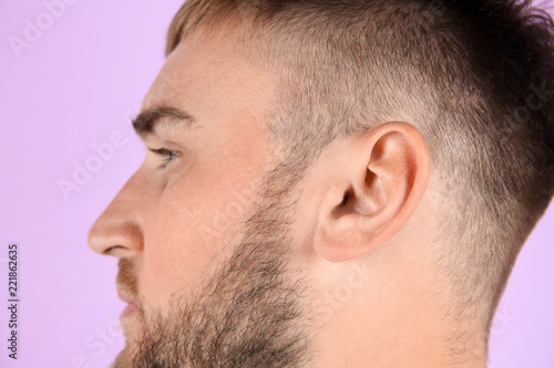 © New Africa, Obraz premium Young man on color background, closeup. Hearing problem