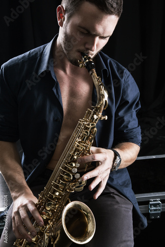 © Dangubic, Obraz premium Young man playing the Saxophone.