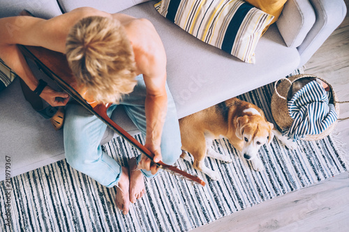 © Soloviova Liudmyla, Fototapeta premium Young man plays on guitar sitting on sofa and beagle dog listen muisic lying near on the carpet