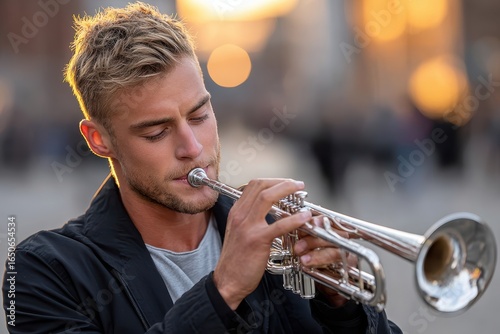 © YouraPechkin, Obraz premium Young man plays trumpet in sunset light in a busy city square