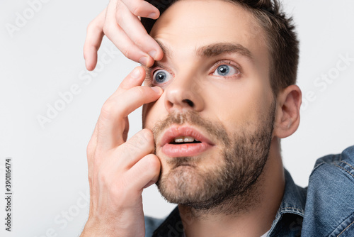 © LIGHTFIELD STUDIOS, Obraz premium Young man putting contact lens in eye isolated on grey