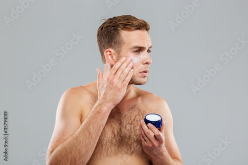 Obraz premium Young man putting cream lotion on face
