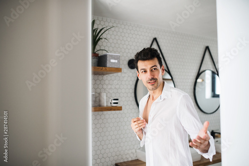 Fototapeta premium Young man putting on shirt in the bathroom in the morning.
