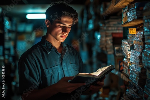 © AzamGold, Fototapeta premium Young Man Reading in Dim Office Storeroom