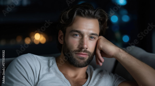 © Mselected, Fototapeta premium Young man relaxing indoors, deep in thought, evening light