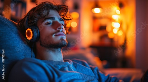 Obraz premium Young Man Relaxing with Headphones in Cozy Ambient Light