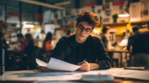 © BerkahStock, Fototapeta premium Young man reviewing documents at a busy office.