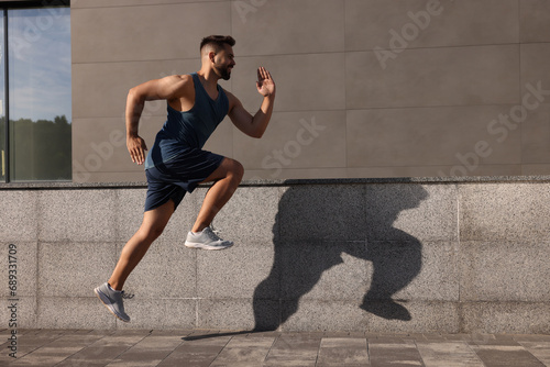 © New Africa, Fototapeta premium Young man running near building outdoors. Space for text