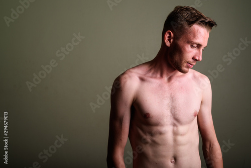 © Ranta Images, Fototapeta premium Young man shirtless against colored background looking down
