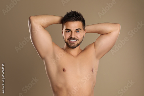 © New Africa, Fototapeta premium Young man showing hairless armpits after epilation procedure on brown background