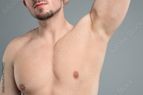 © New Africa, Fototapeta premium Young man showing smooth armpit after epilation procedure on light grey background, closeup