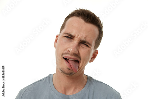 © Rychko Yevhen, Obraz premium young man shows her toung, feels disgust on white background.