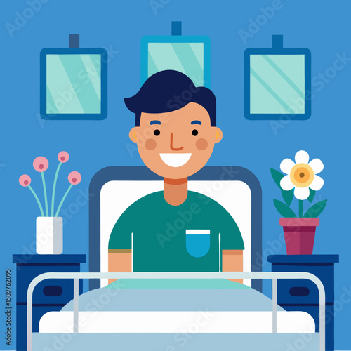 © Kristelinmind, Obraz premium Young man sitting in hospital bed smiling with flowers around