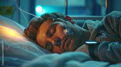 Obraz premium Young man sleeping peacefully in a hospital bed, attached to medical...