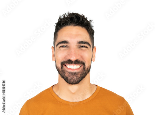 © Mego-studio, Obraz premium Young man smiling against white background.
