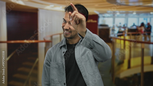 Fototapeta premium Young man smiling confidently in a modern hotel lobby, pointing forward with a friendly gesture, capturing an inviting atmosphere indoors with warm lighting.