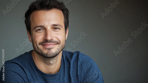 © Henry, Obraz premium Young man smiling warmly, soft light enhancing his cheerful expression, minimal background.
