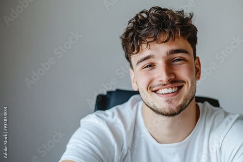 Fototapeta premium Young man smiling, white t-shirt, grey background.