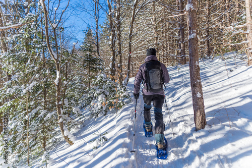 © mbruxelle, Obraz premium Young man snowshoeing in winter, in the Quebec eastern townships