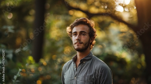 © PuriStudio, Obraz premium Young man standing in a lush green forest during golden hour with soft sunlight illuminating his features, creating a serene and peaceful atmosphere.