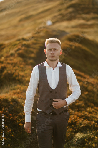 © andriyyavor, Obraz premium young man standing on a mountain at sunset