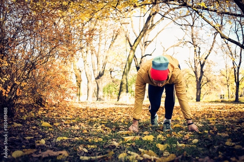 Fototapeta premium Young man start run . Autumn season.