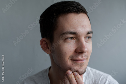 © Alina Belych, Fototapeta premium Young man struggling with acne on his face caring for his skin pushes acne