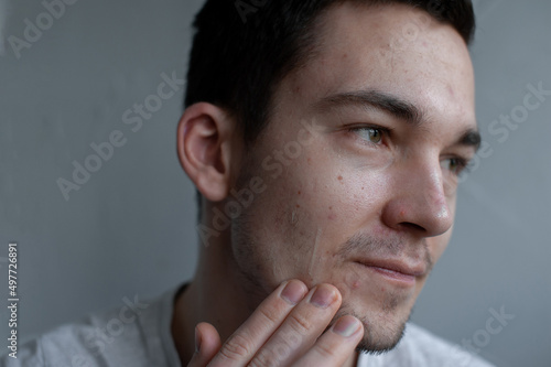 Obraz premium Young man struggling with acne on his face caring for his skin pushes acne...