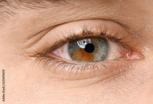 Fototapeta premium Young man suffering from allergy, closeup. Red eye