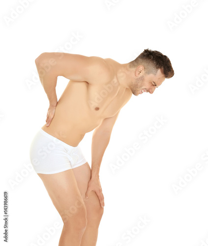 © Africa Studio, Fototapeta premium Young man suffering from back pain on white background