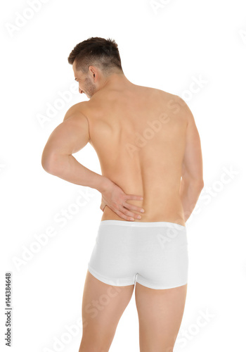 © Africa Studio, Fototapeta premium Young man suffering from back pain on white background