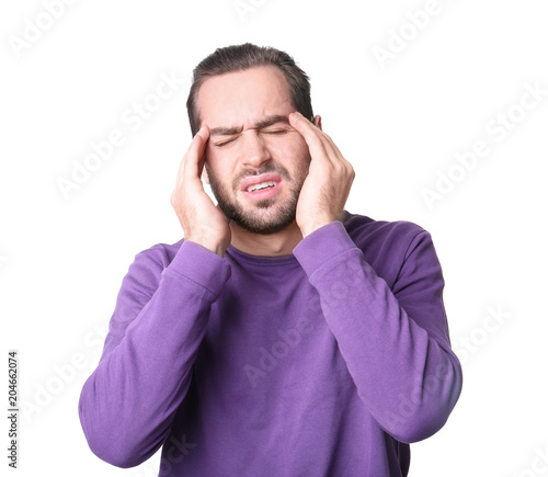 © New Africa, Naklejka premium Young man suffering from headache on white background
