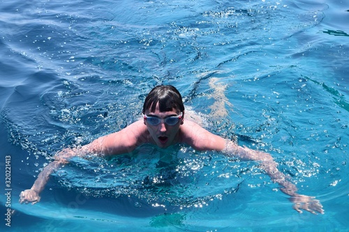 Fototapeta premium young man swimming in blue water portrait
