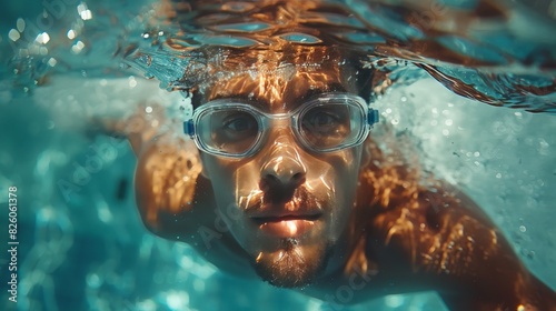 Naklejka premium Young man swimming the front crawl in a pool, taken underwater.
