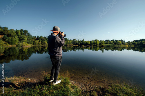 Obraz premium Young man taking pictures of a lake