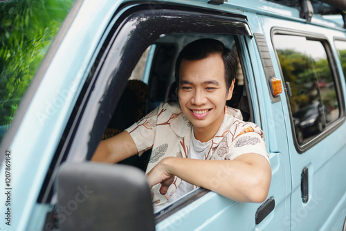 © DragonImages, Obraz premium Young man travelling in his van around the city