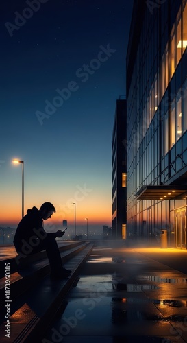 © Ariestia, Fototapeta premium Young man uses illuminated handheld device while sitting on exterior steps near modern building at twilight