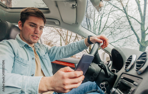 © Masson, Obraz premium Young man using smartphone in car, Wroclaw, Poland