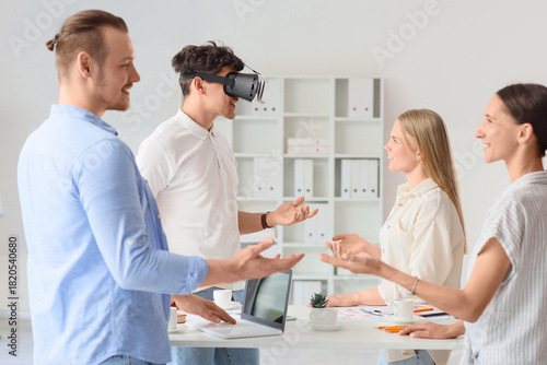 Fototapeta premium Young man using VR glasses with his colleagues in office
