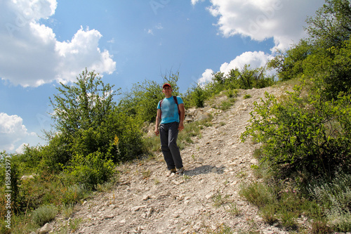© natalysavina, Fototapeta premium young man walks down a hill on a stone road