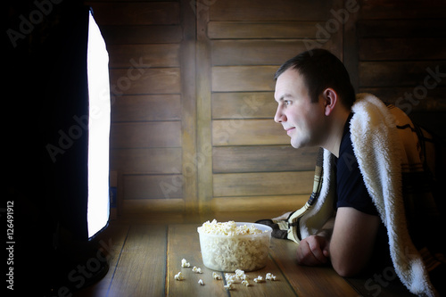 © alexkich, Fototapeta premium young man watching television at home on the floor