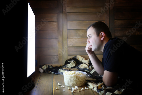 © alexkich, Naklejka premium young man watching television at home on the floor