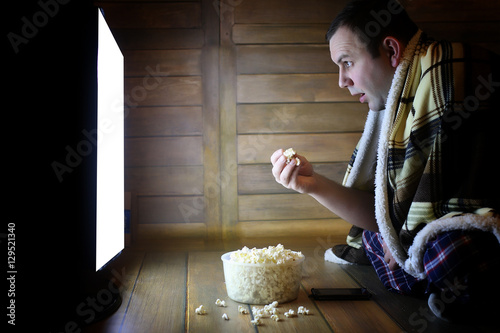 © alexkich, Naklejka premium young man watching television at home on the floor