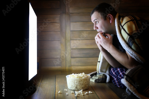 © alexkich, Naklejka premium young man watching television at home on the floor